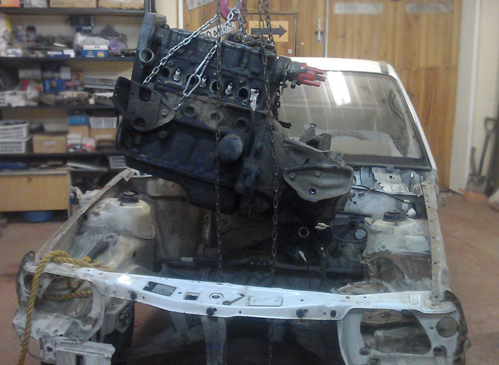 И вот настал черед вынуть двигатель и освободить моторный отсек для начала восстановительных работ по кузову.