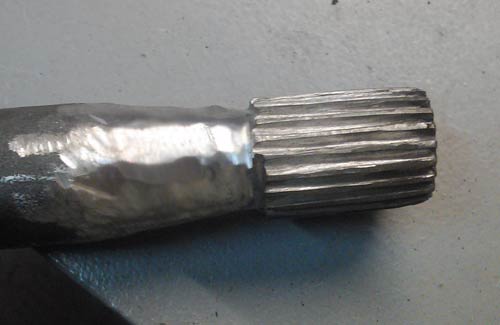 Ну, собственно, кому интересно, за неимением возможности произвести токарные работы, пришлось повозиться вручную и нарезать шлицы болгаркой, т.к. варить полуось в стык уж очень не хотелось, ибо велик риск того, что она потом сломается...