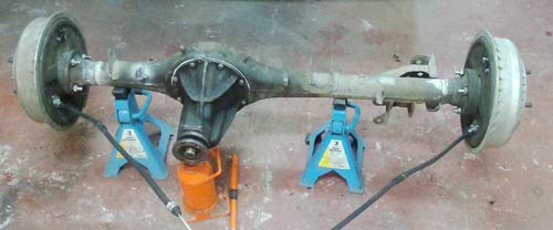 А вот уже всё в сборе: Мост укорочен! В моем случае нет необходимости центрального расположения редуктора, поэтому я укорачивал только одну сторону, дабы не делать эту работу два раза. К тому же "чулок" который я выбрал для укорачивания, имел деформацию (был погнут). А так получилось, что его даже править не пришлось. Я как раз вырезал гнутый кусок и приварил предварительно оцентрованный по месту фланец, в результате получив исправную и укороченную балку заднего моста.